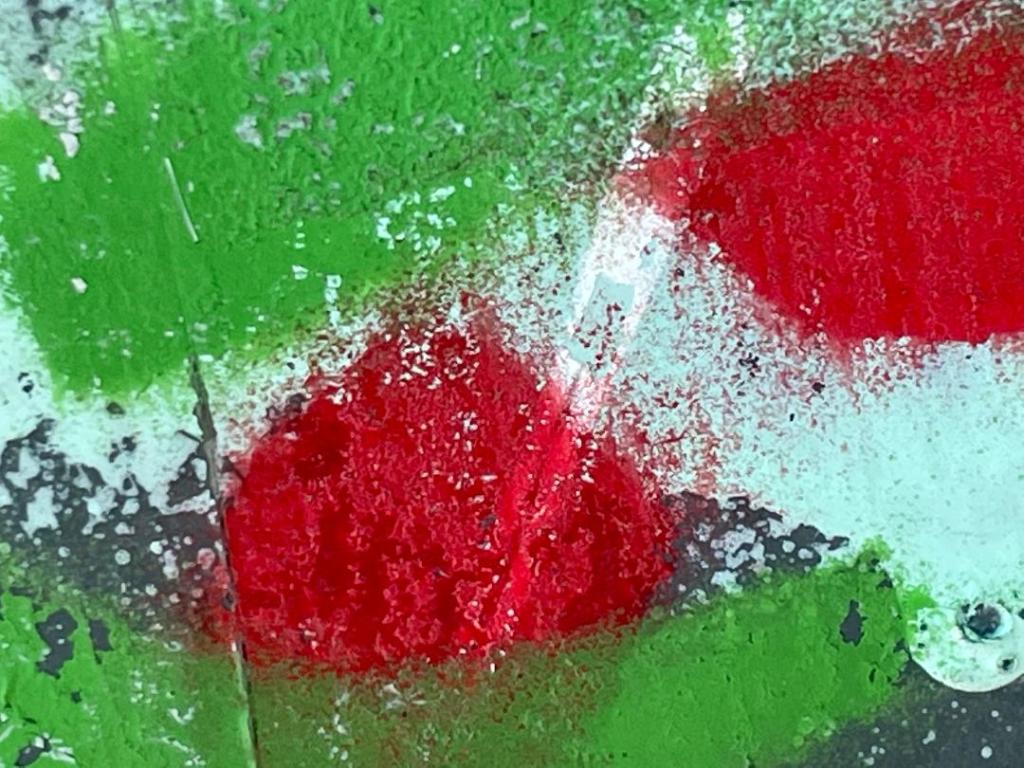 Au fil de la curiosité, de l’inspiration, Anatoly Orlovsky joue avec les variables de son art, telles la couleur et la granulation. Évidemment, il s’agit toujours d’une graine simulée, photographiée. Dans un diptyque, de grandes masses rouges de couleur effilées et granulées aux lisières sont contrastées avec un champ vert prairie, lui aussi texturé et granulé, avec des zones blanches de distanciation, intercalées aux couleurs primaires et secondaires. Qu’est-ce que ces photos nous montrent, vraiment ? Mystère du trompe-l’œil. L’insertion de segments de cercle apparemment vitreux de nature géométrique dans la composition, versus l’imprécision du naturel, peut suggérer une dichotomie culture-nature.