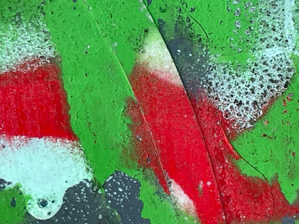 Dans une composition lumineuse qui évoque un peu Miró, l’on observe des entailles courbes, d’un gris foncé et bien prolongées, contrastées à un rouge vif et lumineux. On voit une réminiscence précise de l’histoire de la peinture, en l’occurrence du cubisme orphique et de l’expressionnisme abstrait.