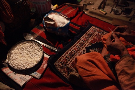 In this photo, there is an accomplished colour gradation of pink, yellow-orange, earth colour, white, brown and black in the criss-crossed bands of the blanket. The photography is painterly.