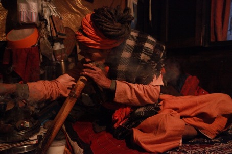 The yogi’s brown shanks are flanked by his upright arms adorned with wooden rings, all being of the same hue. One senses great unwavering strength of spiritual origin. It is almost a trompe l’oeil. The yogi’s body seems wrought of dark wood. The photographer resorted to deep attention and concentration in securing such a scene. The sour cherry-coloured reddish carpet perfectly complements the body of the yogi.
